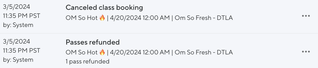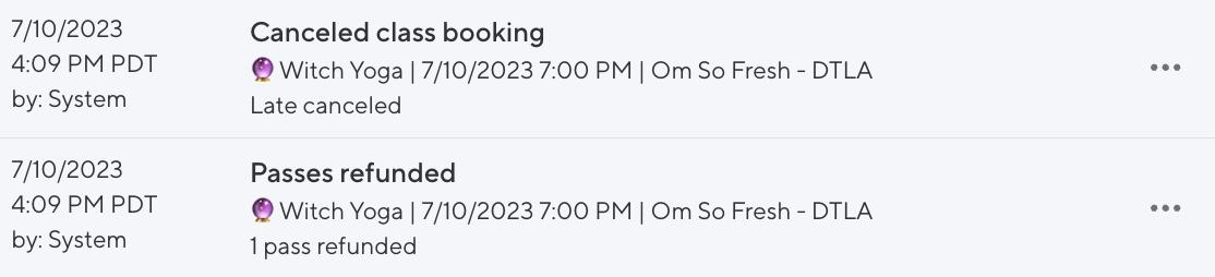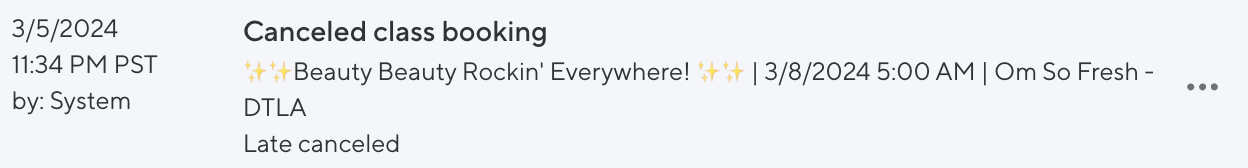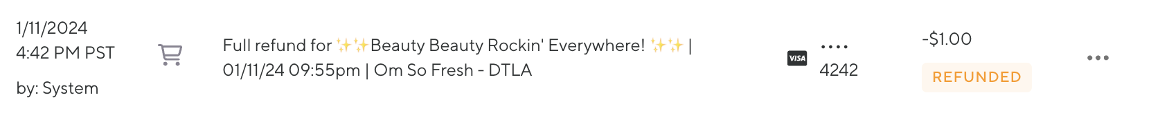 In our example the drop-in booking was canceled (and refunded) at 4:42pm on 1/11 for the class ✨✨Beauty Beauty Rockin' Everywhere! ✨✨ | 01/11/24 09:55pm | Om So Fresh - DTLA