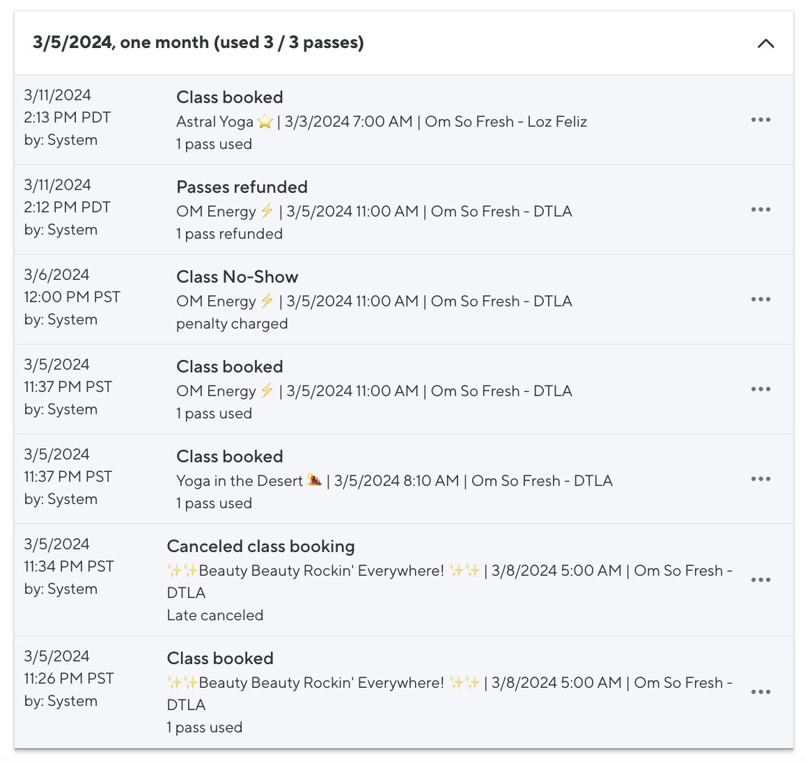 Late cancelations where the client loses their pass will have one line item noting Canceled class booking Late Canceled. Because the initial booking used the pass, the pass is not refunded if a client loses a pass when a class is late canceled.