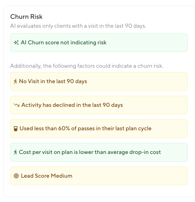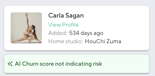 Look for the churn score badge at the top—it will show if the AI is indicating risk or not