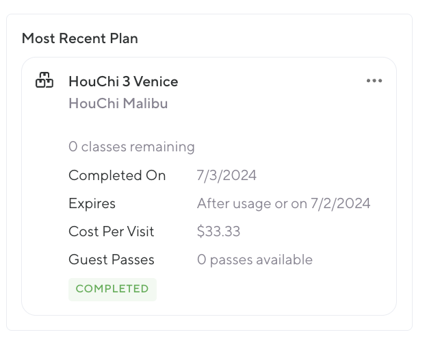 Shows whether the client currently has an active membership or pass, along with usage details.