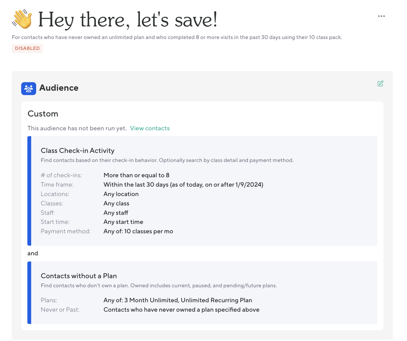 Conditions act as filters within audiences. They help you identify individuals based on specified qualities and behaviors. Once assigned to an audience, when the automation sends and to whom the automation sends is determined by the conditions that make up your audience.