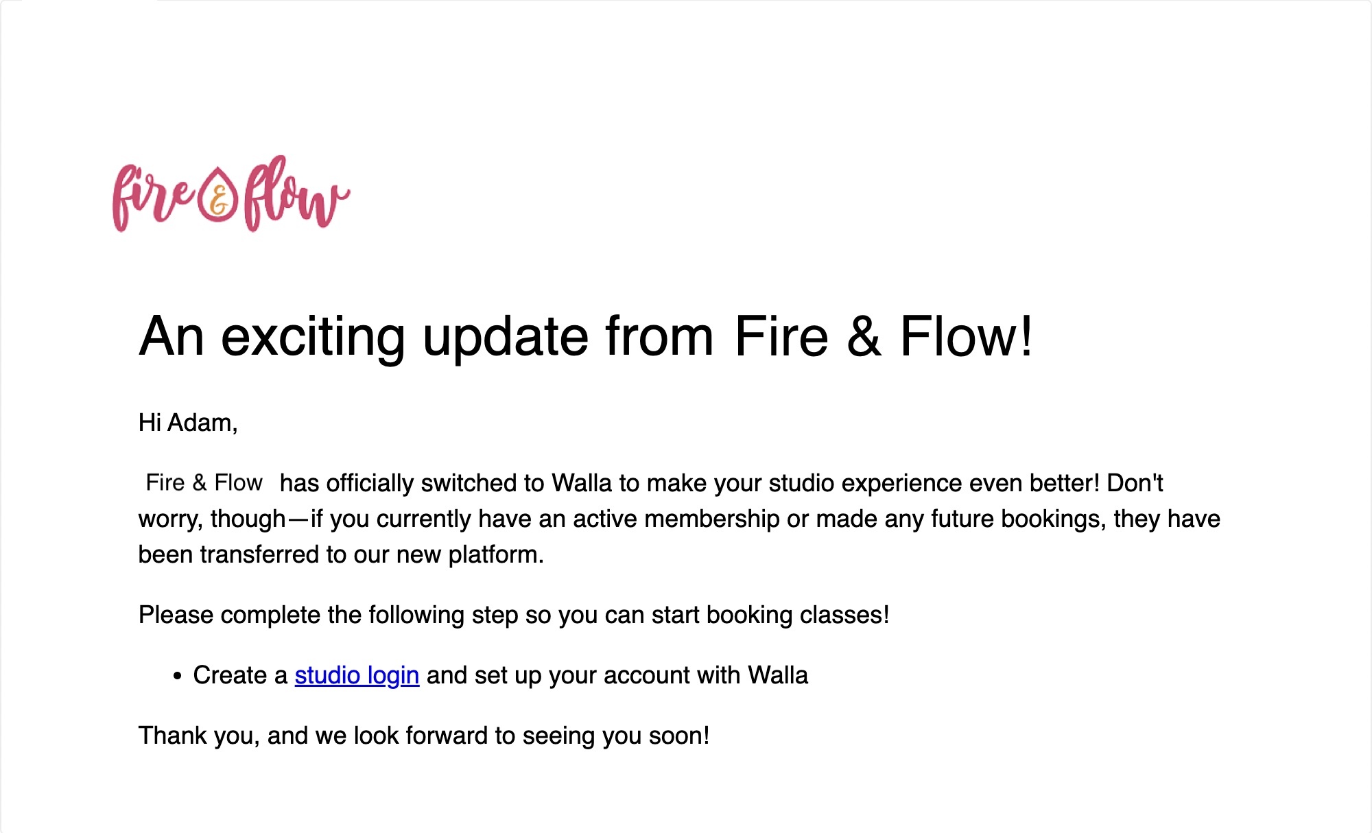Once your data is migrated into Walla from your previous software or mailing list, Walla will send a welcome email to your clients informing them that they can now create a studio login and set up their account with Walla to access their active plans from migration.