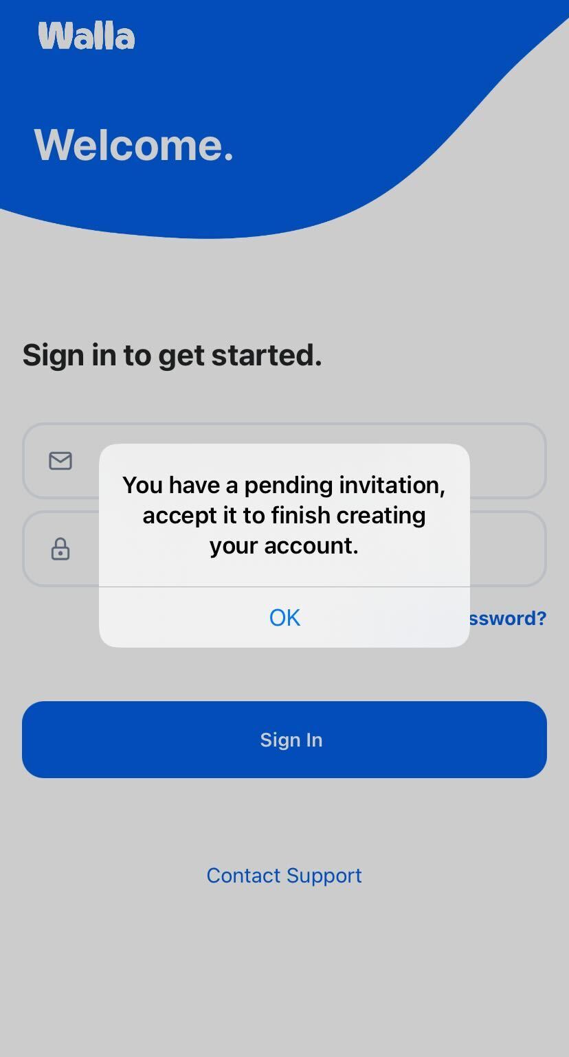When I log in to the Walla App, the app says: "You have a pending invitation, accept it to finish creating your account." | Walla Support Center