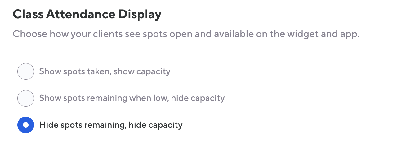 Choose how your clients see spots open and available on the widget and apps. The threshold for Show spots remaining when low, hide capacity is three spots regardless of the maximum capacity.