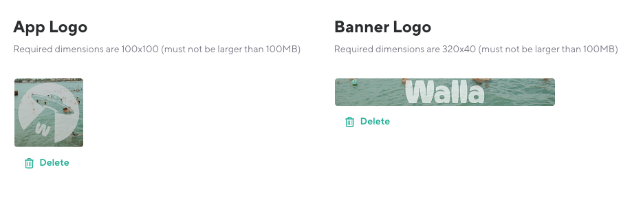 App Logos settings has two distinct logos that work together in the Walla App to represent your business. Accepted file types: BMP, JPG, JPEG, PNG, SVG, and TIFF.