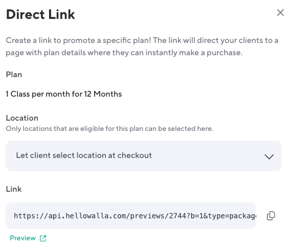 Generate a link to a single plan so your clients can complete a purchase. Plan does not have to have List Online checked under plan settings in order for client to be able to purchase the plan. All other plan restrictions such as Can Be Purchased By Members Only and Purchasable Once always apply.